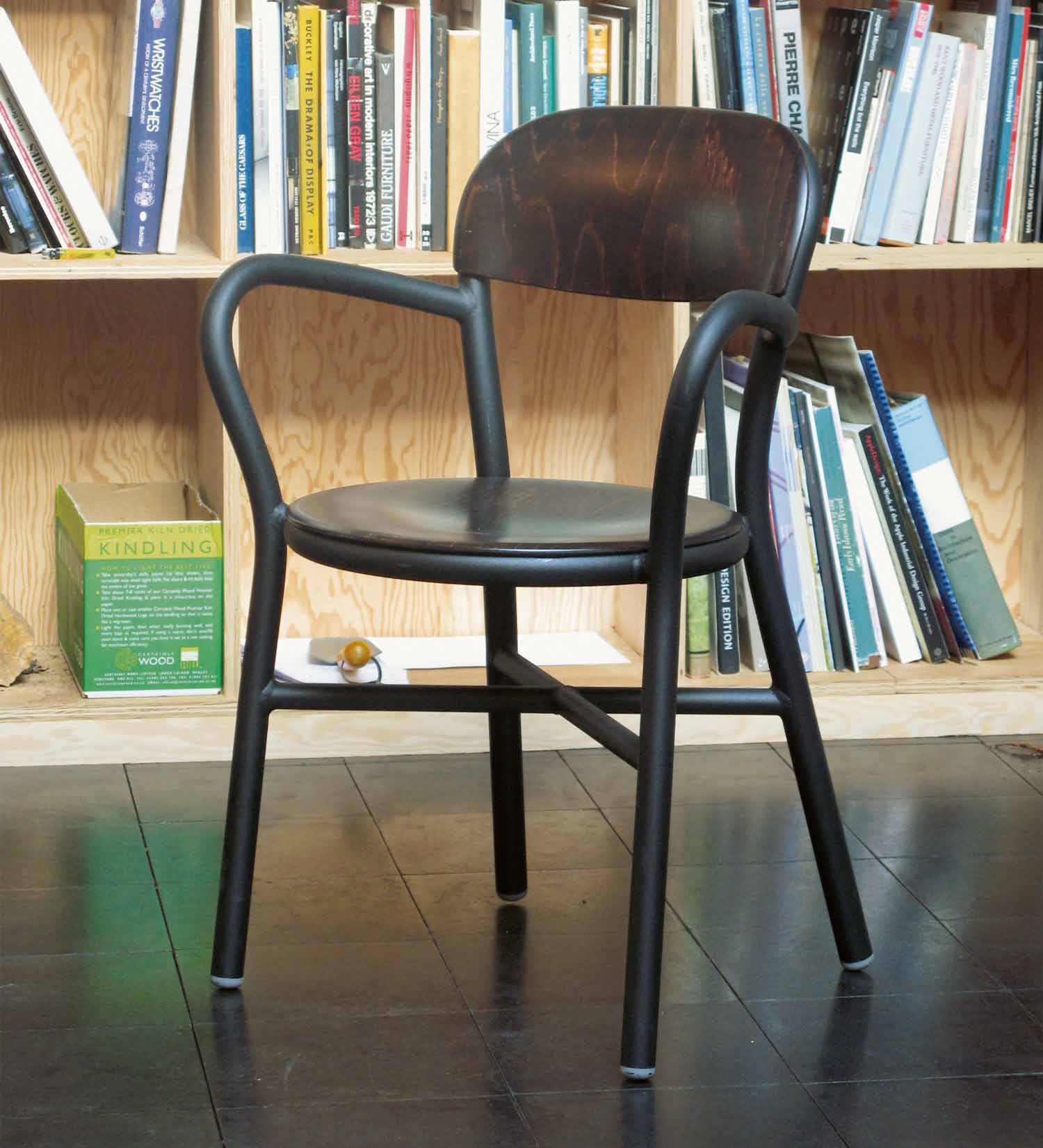 The Pipe Chair has an aluminium structure and an option of an aluminium seat and back with holes for outdoor use or high-pressure resinated plywood for indoors or light outdoor use. There’s an armchair and a normal chair version. The tooling for the chair is remarkable, with a variety of state-of-the-art bending machines controlling the tubes’ 3-D profiles. It’s beautifully made and probably one of the strongest chairs ever built as I chose a large-diameter tube and the structure (especially the armchair) is very rigid. It stacks like a French café chair on the X under the seat, allowing four or five in a stack before it gets too high.