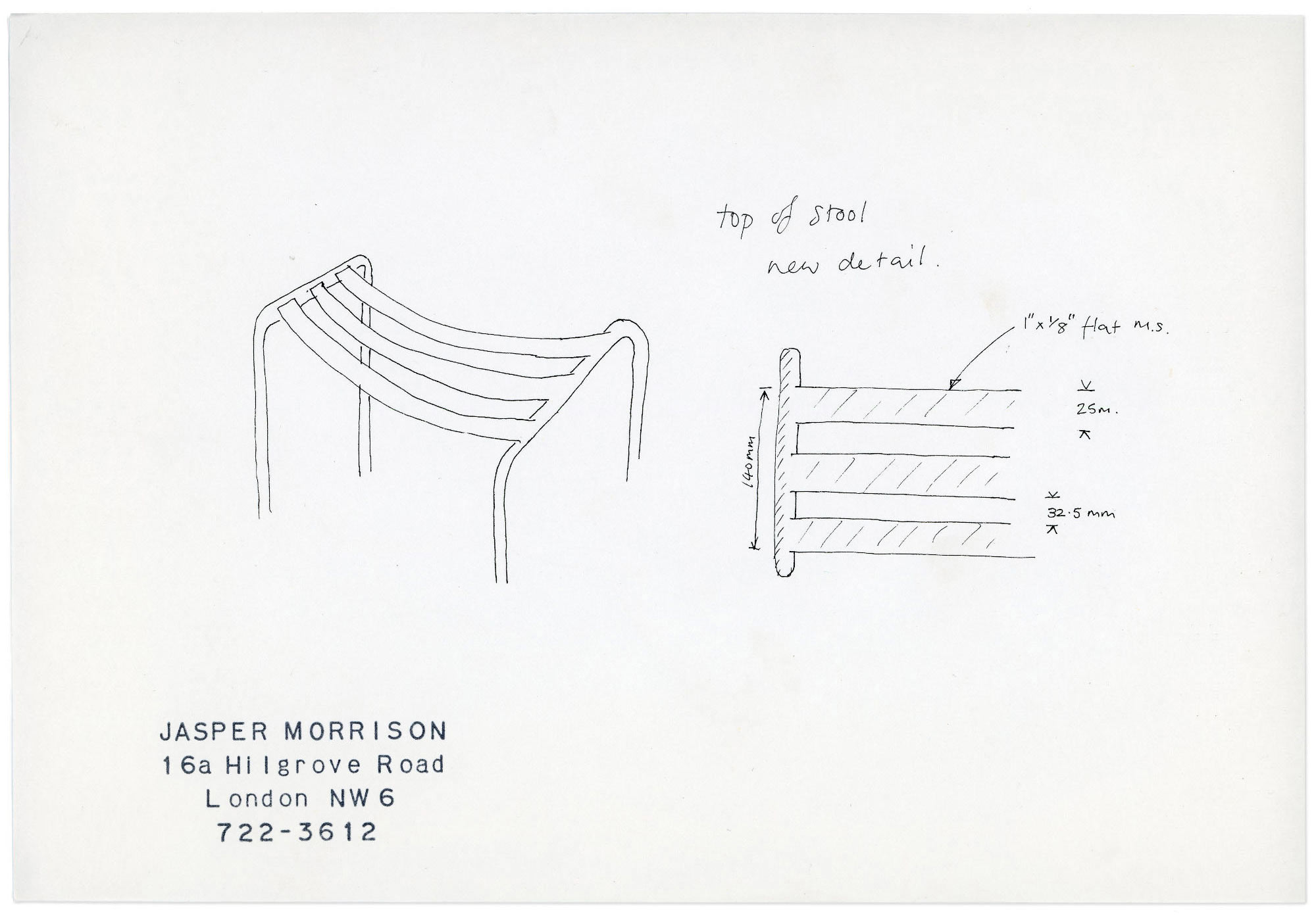 The Slatted Stool in mid 1985. A sketch of the stool provided to SCP for production. Jasper discovered by chance that the Slatted Stool had been used on packaging for tights.