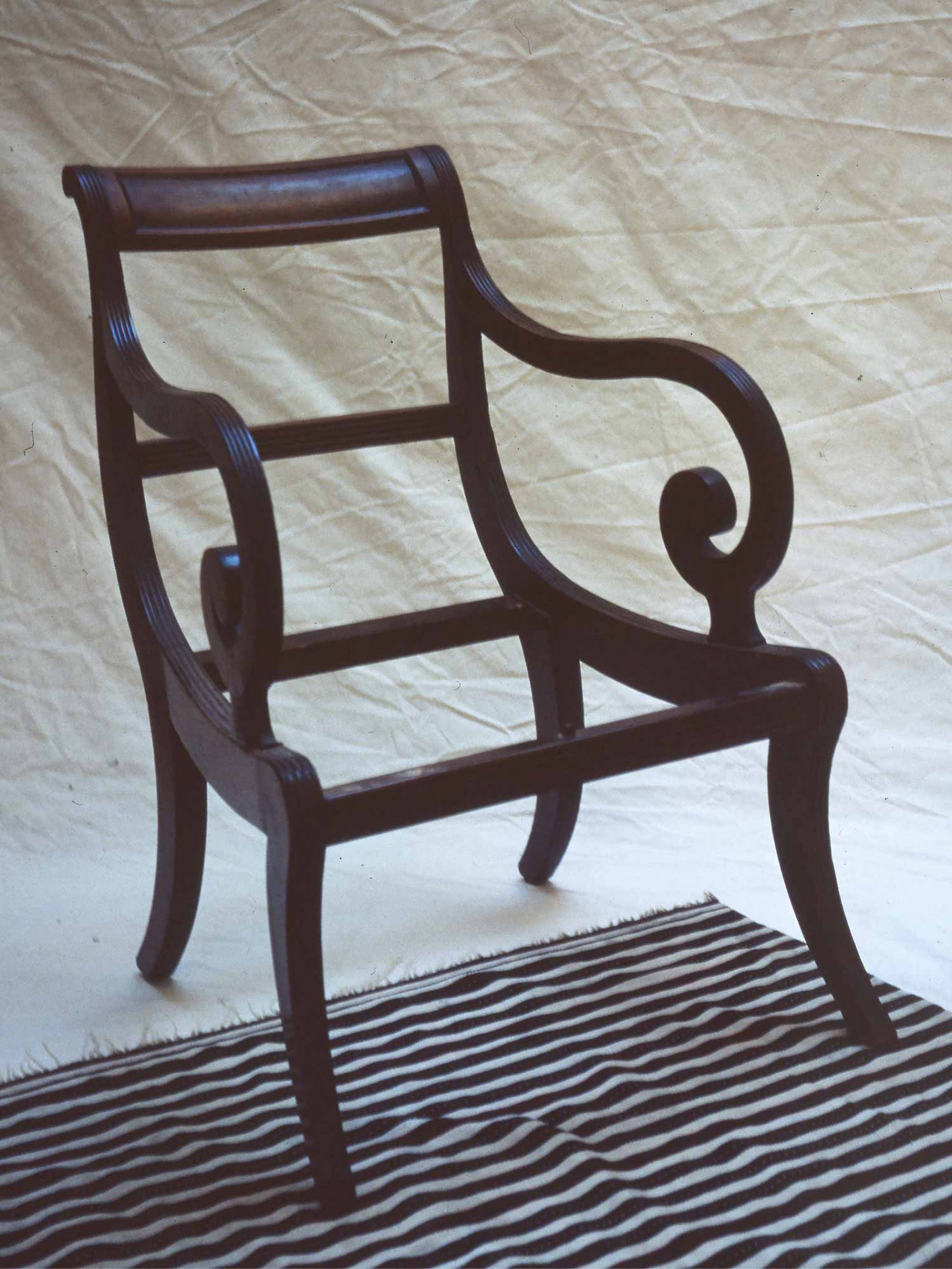 This antique chair without its seat cushion inspired the Thinking Man’s Chair.