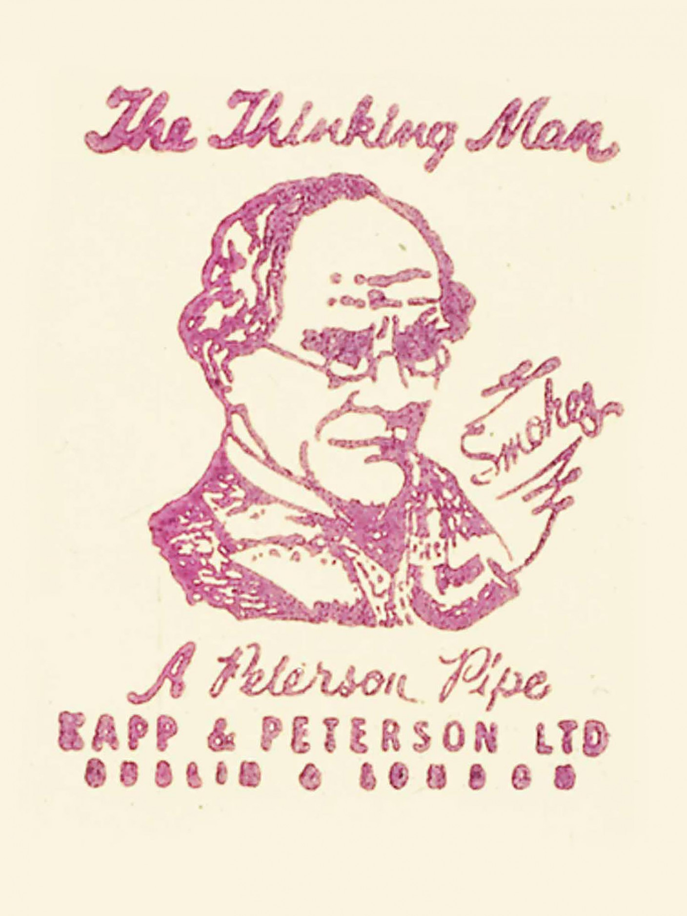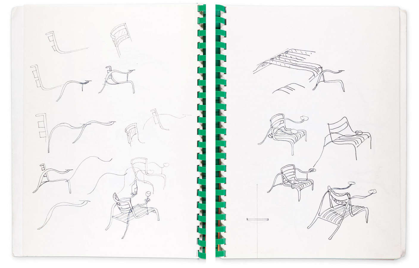 I saw an antique chair with its seat cushion removed for repair. It looked more interesting without the cushion and I decided to try to design a chair which was all structure and no closed surfaces. Many sketches later I arrived at an approximation of the final shape, which included two small tables on the ends of the arms and an exotic assembly of curved metalwork. It was to be called ‘The Drinking Man’s Chair’. On my way back from a tobacconist’s shop with a packet of pipe cleaners to make a model with, I noticed the slogan ‘The Thinking Man Smokes’ on the packet, which I quickly adapted as a more sophisticated title.