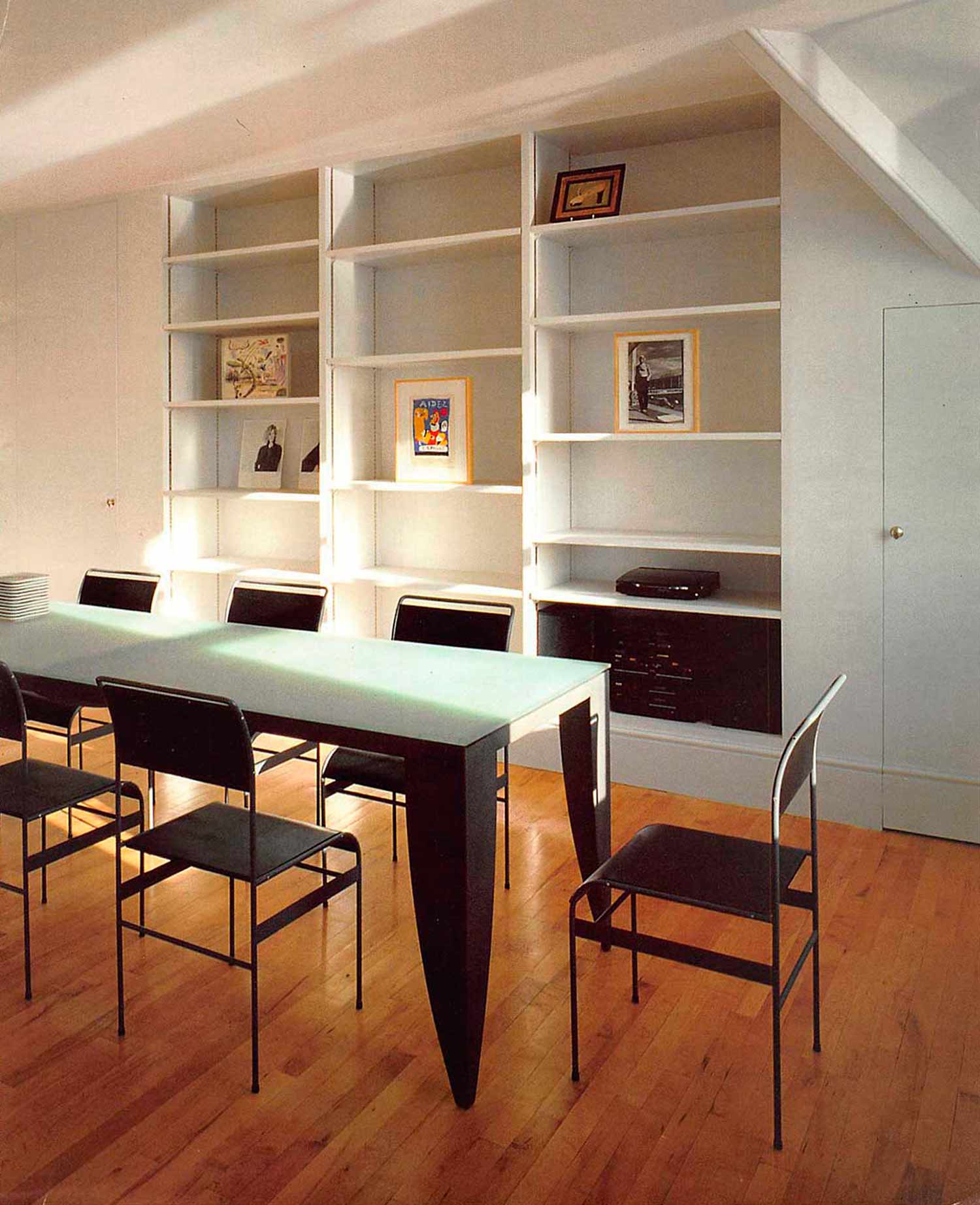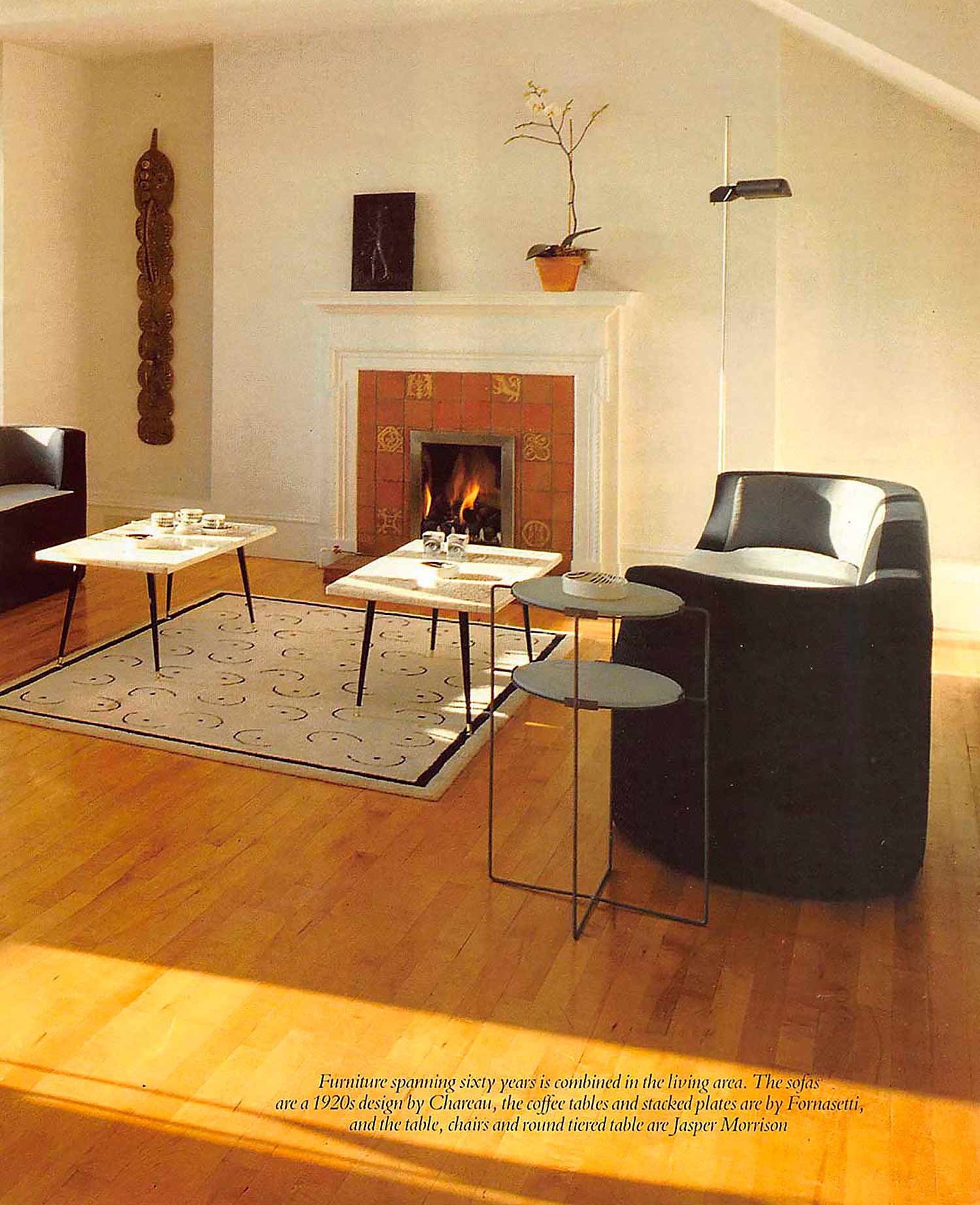 Dagny Corcoran commissioned Jasper to design a table and chairs for her apartment in London. Around the same time she acquired a Thinking Man’s Chair, a Side Table and a Rug of Many Bosoms. World of Interiors published these photographs in its October 1987 issue.