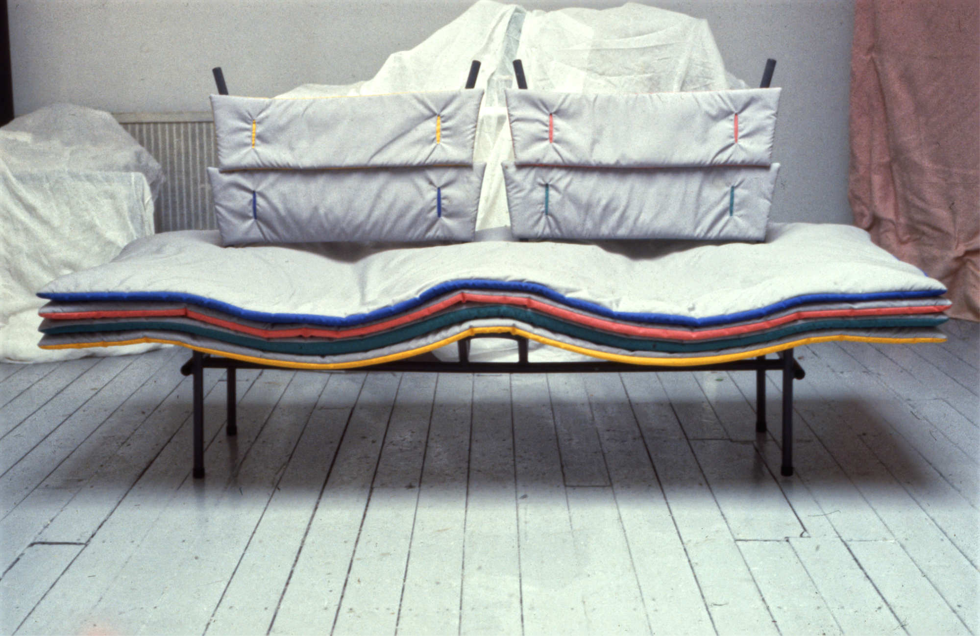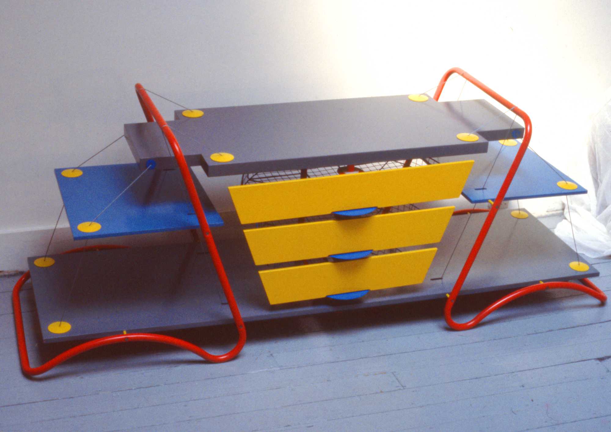 A couple in Holland Park bought the Sideboard. Jasper went to their house to install it. Jasper sees the Sideboard in the context of the Futurism/constructivism-inspired pop culture of the time: colour and sharp edges. It was technical in being held together by pulleys and string. This made it precarious and ‘tense’, as Jasper puts it. He supposes it can’t have been useful, especially not the drawers, which were made in wire mesh.