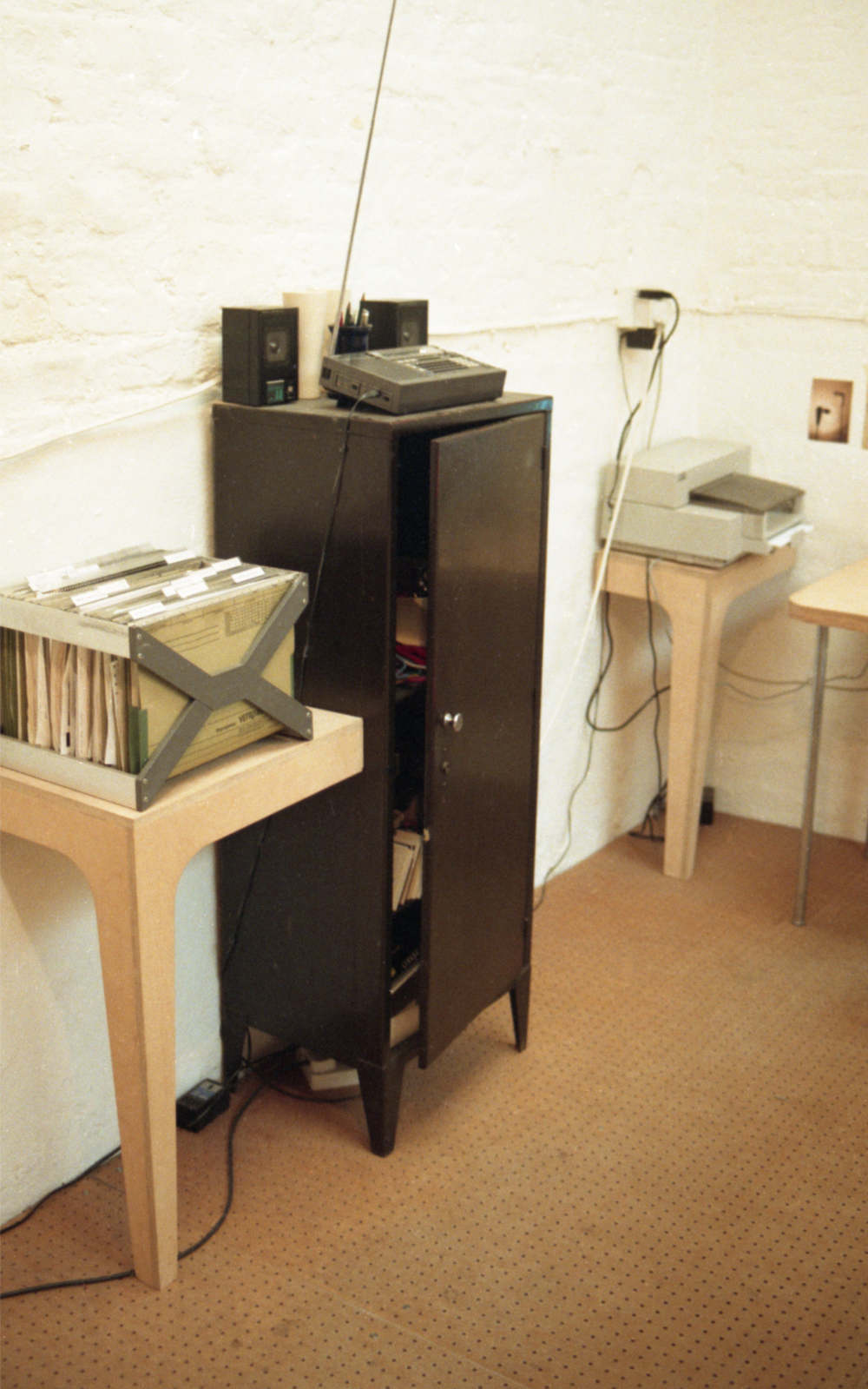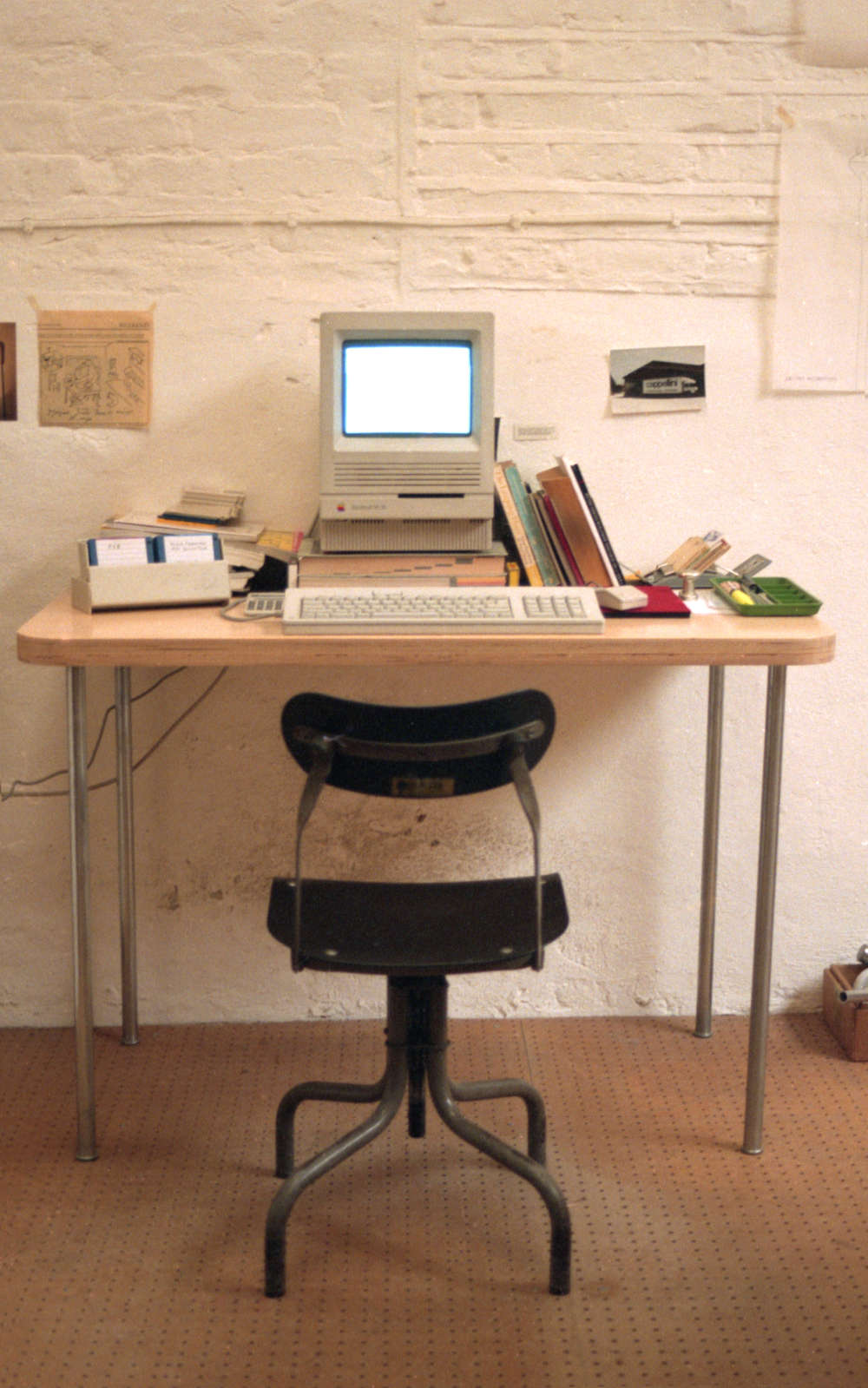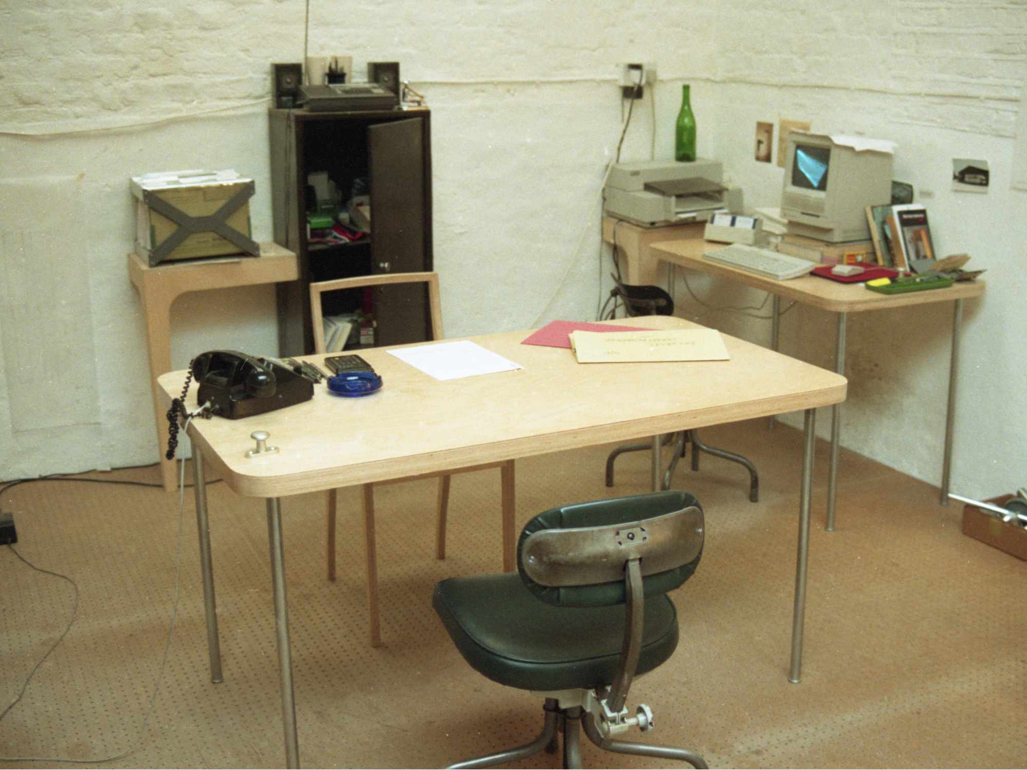 Jasper took his first studio at the start of 1990, at 275 Kensal Road, in north-west London. A journalist interviewed him there and described it so: ‘Other than that box of curves, there’s not much else of note in his windowless studio in London NW10: a single desk, an old telephone, a naked lightbulb, a few boxes filled with assorted junk; no heating to speak of, not even a tea machine. ... this is a downright barren situation. Several as yet unworked sheets of pressboard lie strewn across the floor... The shabby state of his studio furniture is entirely understandable.’