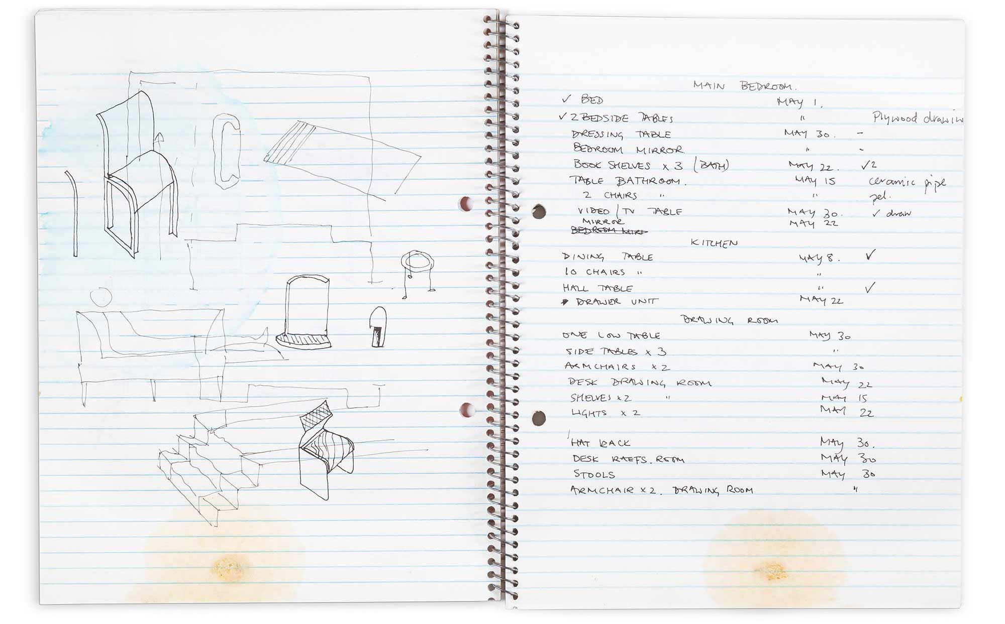 For the apartment he designed a door handle, one-legged table, console table, dining chair, daybed and coat stand, all of which went on to be produced commercially at some point in the following years. The sketch above shows the kitchen. While work progressed on the apartment, Jasper used one of its rooms as his studio. In 1986, he kept his notes, to-do lists and sketches about the project in a series of red notebooks. He made lists of hardware to buy from the long-standing supplier Oakdens, using their catalogue, and went back and forth to the shop on Curtain Road to make his purchases.