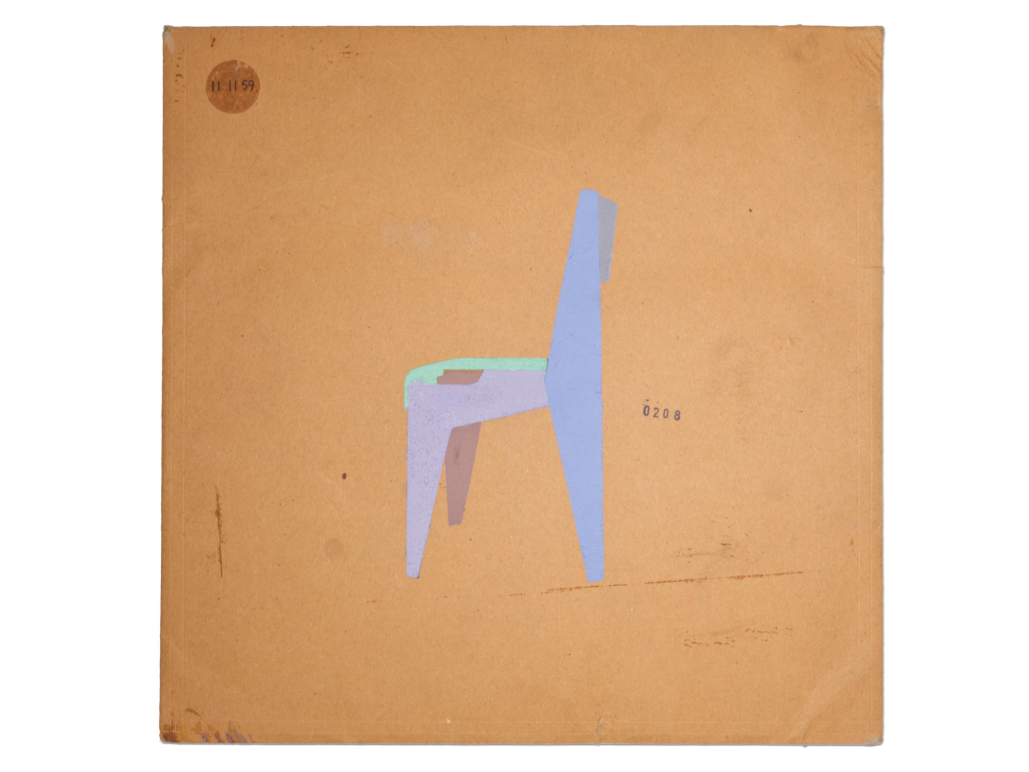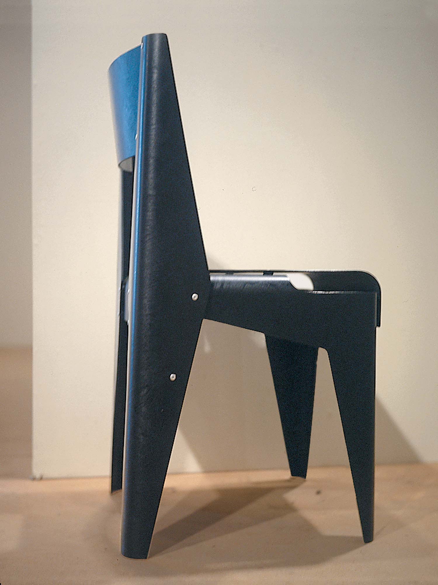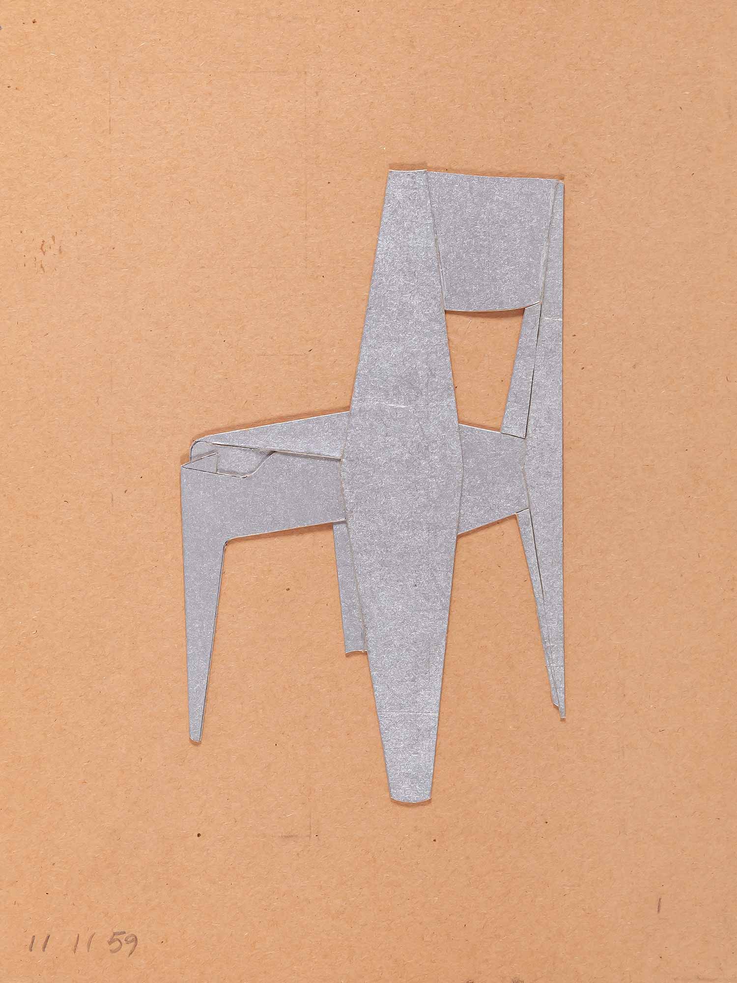 The Moulded Plywood Chair was light and unrealistically fragile. Only one finished prototype was made in black-painted plywood. The collage of the chair (below) may have been submitted for Jasper’s final examination at the Royal College.