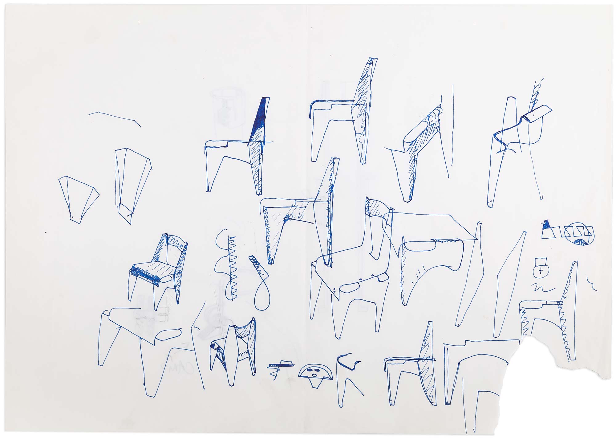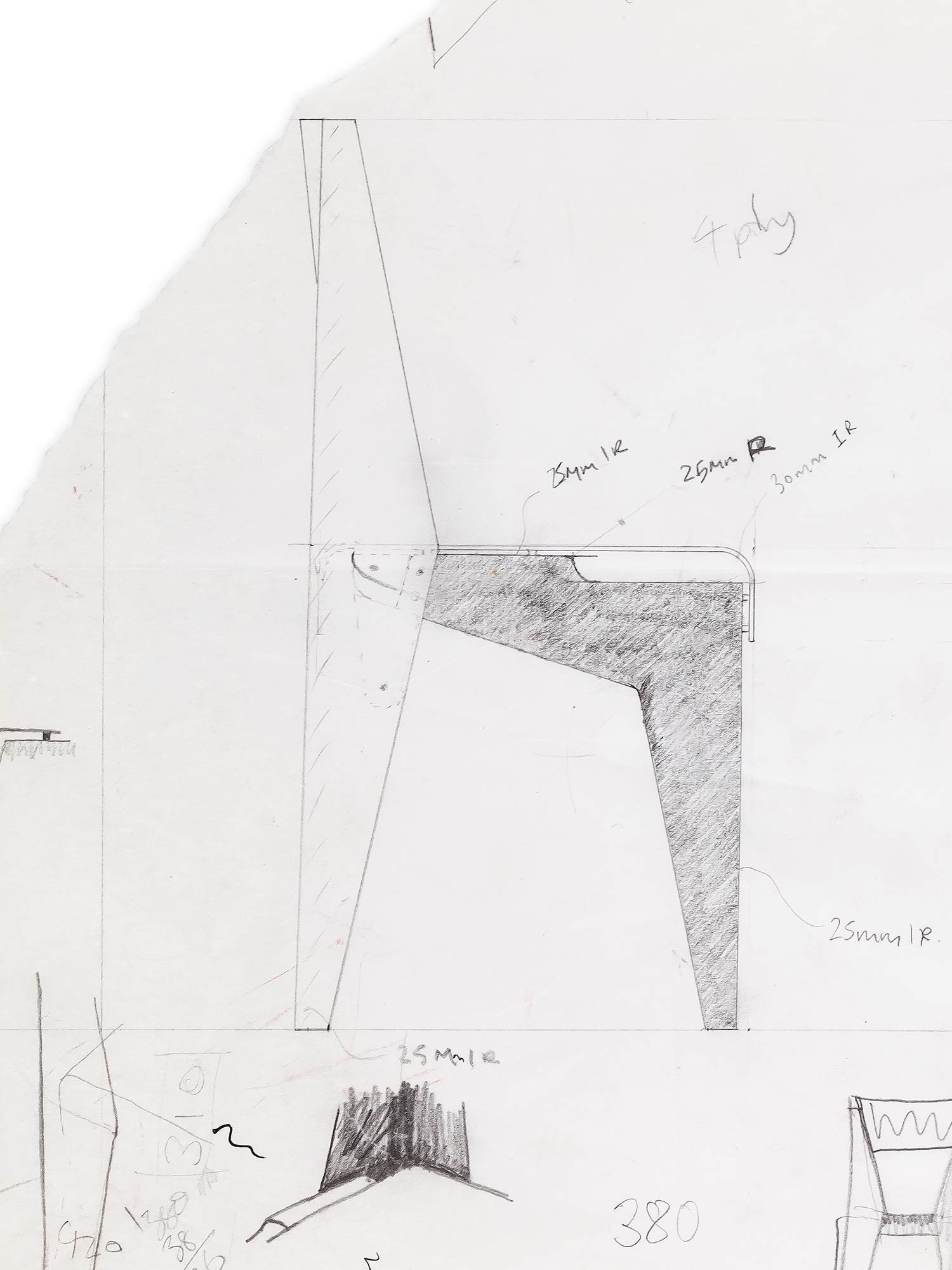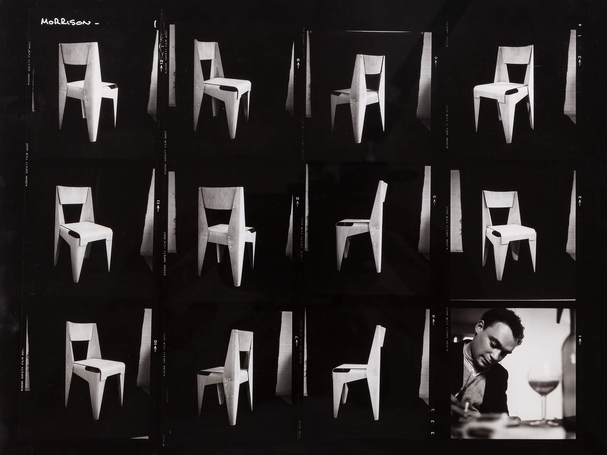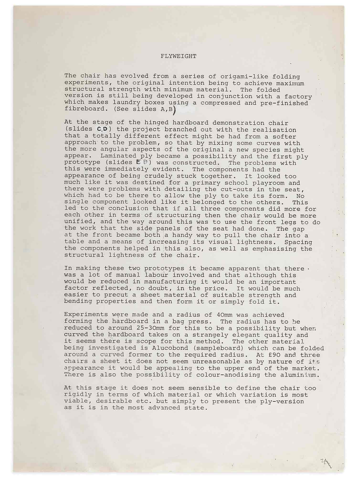 The Moulded Plywood Chair developed from Jasper’s work on the Laundry Box Chair in his final year at the Royal College of Art. In a piece about it for his tutors entitled ‘Flyweight’ (below), he wrote that the project branched out with the realisation that a totally different effect might be had from a softer approach to the problem, so that by mixing some curves with the more angular aspects of the original a new species might appear. Laminated ply became a possibility... The problems with this were immediately evident. The components had the appearance of being too crudely stuck together. It looked too much like it was destined for a primary school playroom and there were problems with detailing the cut-outs in the seat, which had to be there to allow the ply to take its form. No single component looked like it belonged to the others. This led to the conclusion that if all three components did more for each other in terms of structuring then the chair would be more unified, and the way around this was to use the front legs to do the work that the side panels of the seat had done. The gap at the front became both a handy way to pull the chair into a table and a means of increasing its visual lightness.