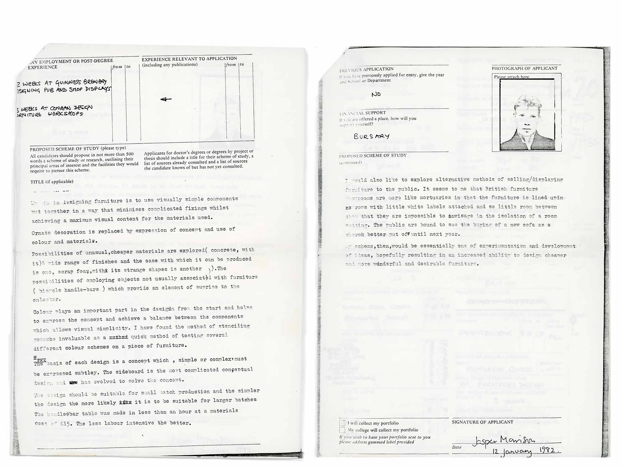 In January 1982 Jasper submitted the application form to study furniture design at the Royal College of Art in London. Sculpture was his second choice of study. He applied for a three-year degree. Following an interview, he was accepted. As part of the application Jasper wrote a ‘proposed scheme of study’, which made reference to the pieces he had recently designed at Kingston. His draft proposal ran as follows: