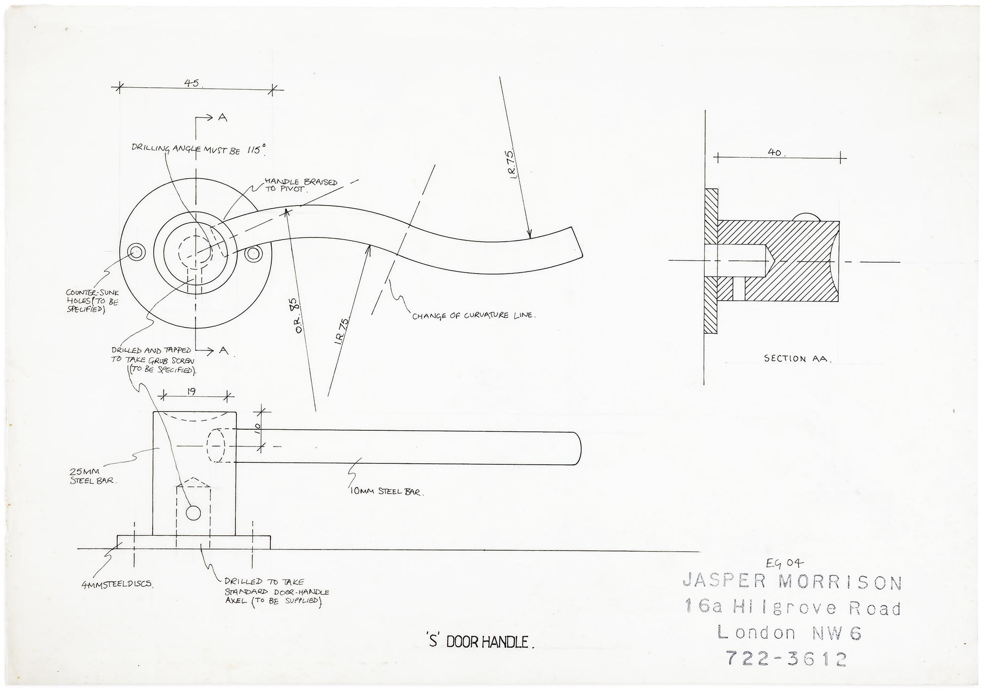 Upon graduation from the Royal College of Art in 1985, Jasper was hired by Nicholas Ward-Jackson to design interiors and furniture for an apartment in Kensington. Jasper designed this door handle for that project, calling it the S due to its shape. Afterwards he made and sold the S Handle to private clients, including a number to the interior designer Doris Saatchi in 1987.