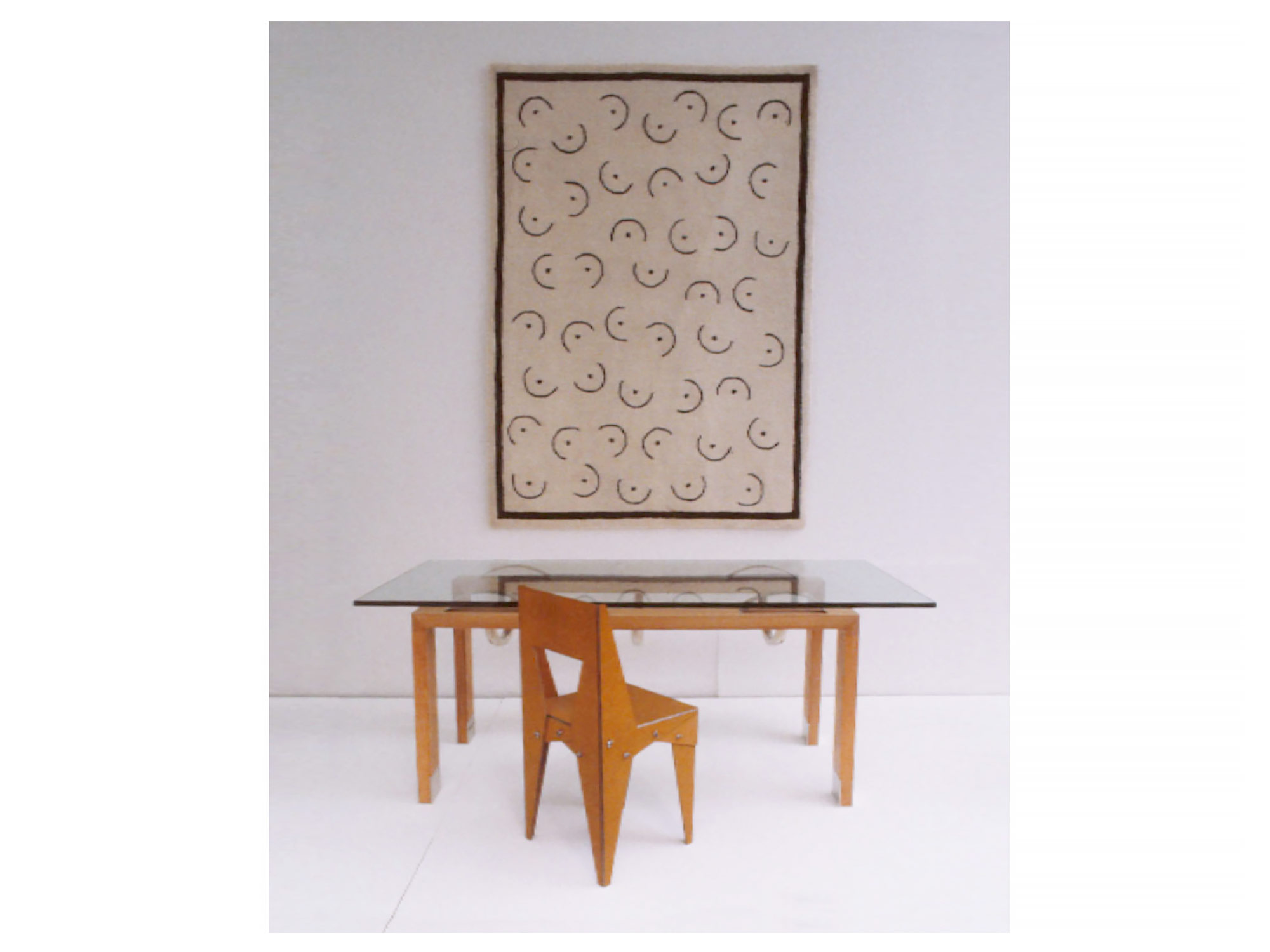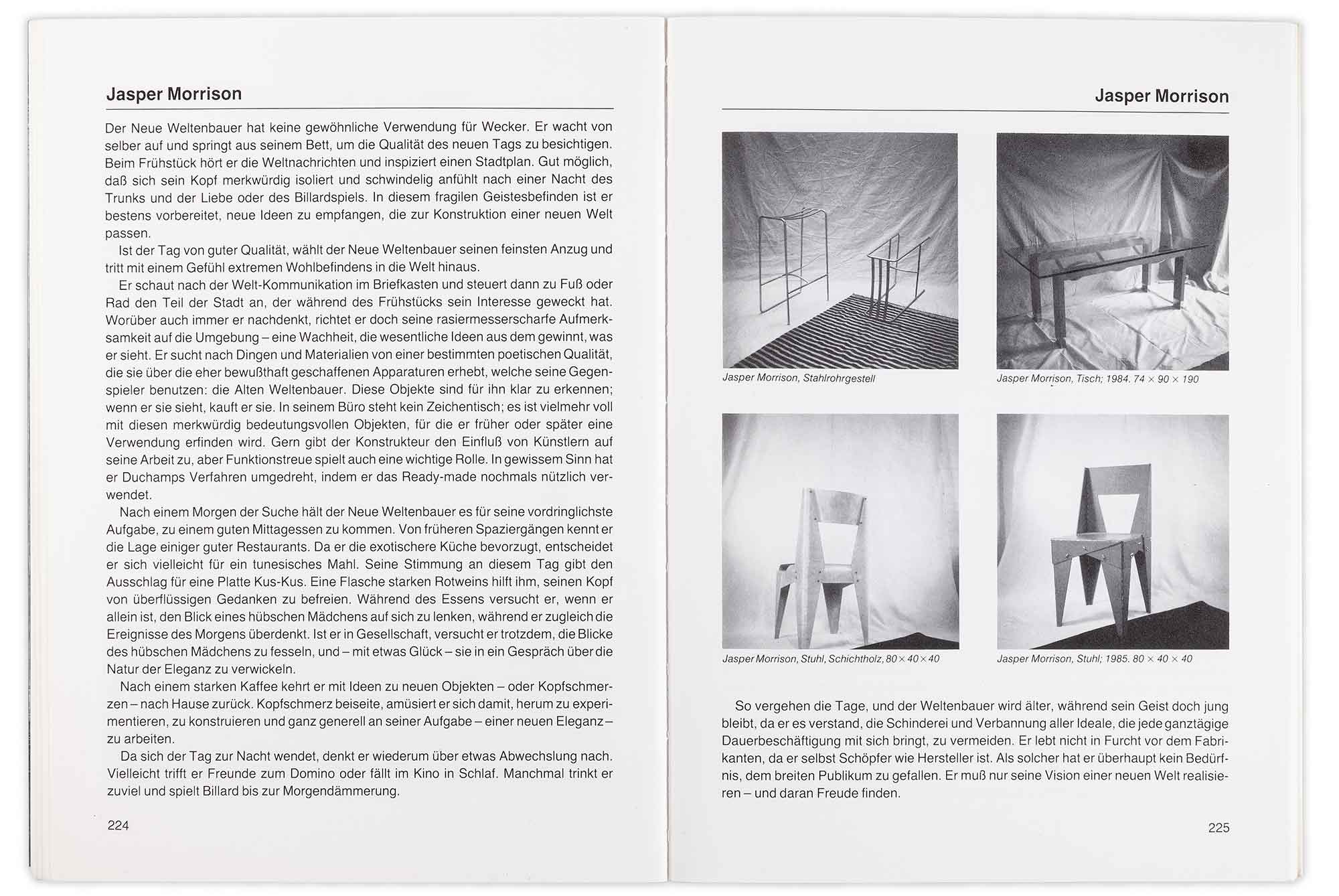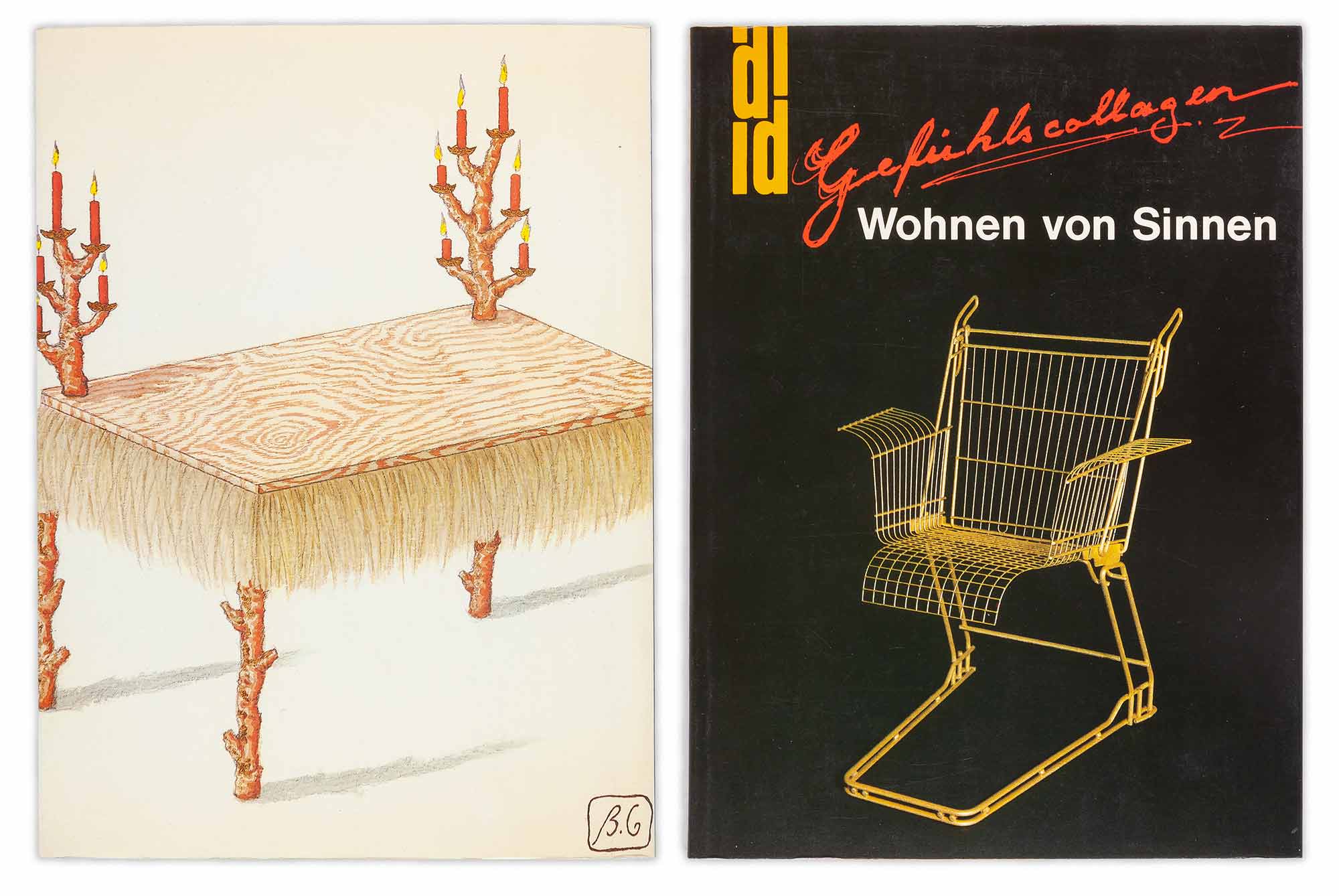 Gefühlscollagen: Wohnen von Sinnen (Emotional Collages: Living from the Senses) was a group exhibition at the Kunstmuseum in Dusseldorf which featured the work of 120 designers from across the world. It developed from the Möbel Perdu exhibition in 1984. Jasper showed the Wing-nut Chair, the Ribbed Table and the Rug of Many Bosoms. The catalogue printed a German translation of his essay ‘The Poet will not Polish’, first published in the Kaufhaus des Ostens catalogue two years before.